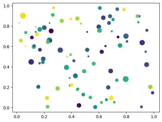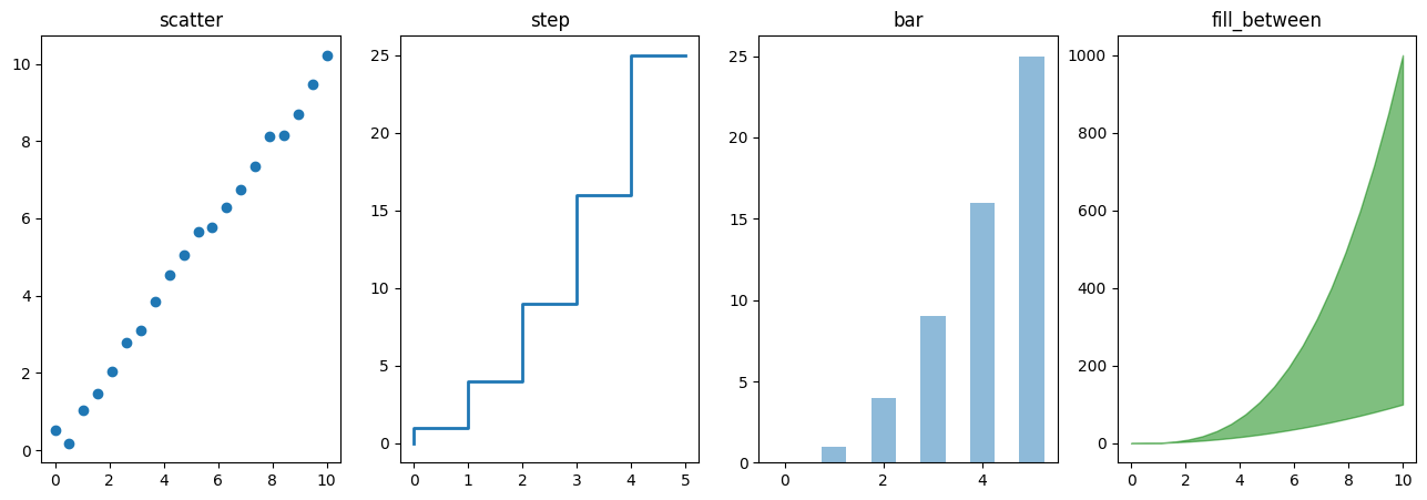 除了折线图,Matplotlib 还支持绘制散点图、柱状图等其他常见图形。下面,我们绘制由散点图、梯步图、条形图、面积图构成的子图。