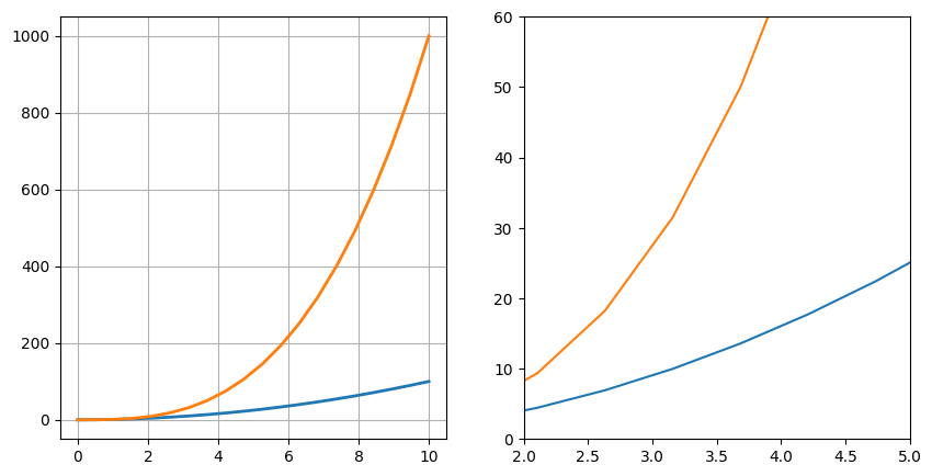 axes[0].plot(x, x**2, x, x**3, lw=2)